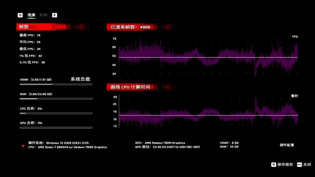 性能測試部分,我們使用Fn+Q切換到狂暴模式確保銳龍7 8845HS可以達到55W滿血輸出,同時在筆記本BIOS中給Radeon 780M集顯手動分配8GB顯存,確保其在遊戲和AI出圖測試中達到最佳狀態。