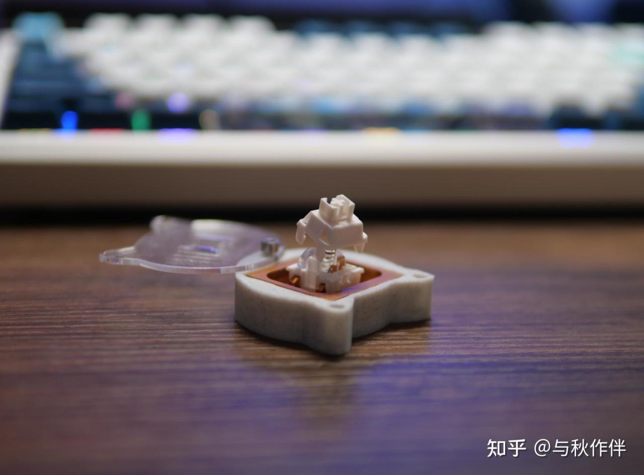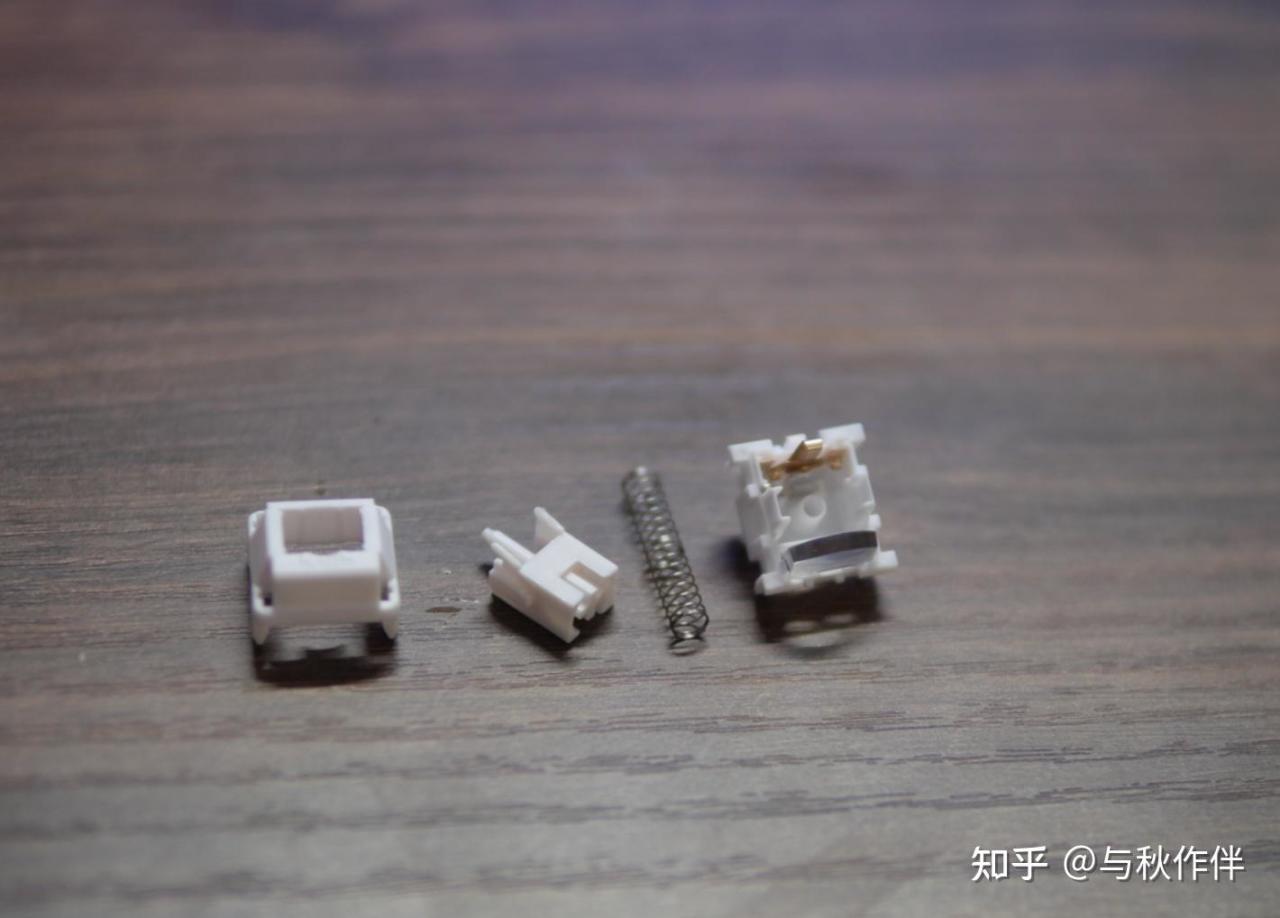 开轴看下它使用了双段加长弹簧,轴心做了比较充分的厂润。因为定位方面主要针对游戏玩家,所以是一款1.2mm触发行程的提前触发轴体,从而获得更为迅速的游戏响应。加长的轴心可以让声音更干净同时减少整体键程。