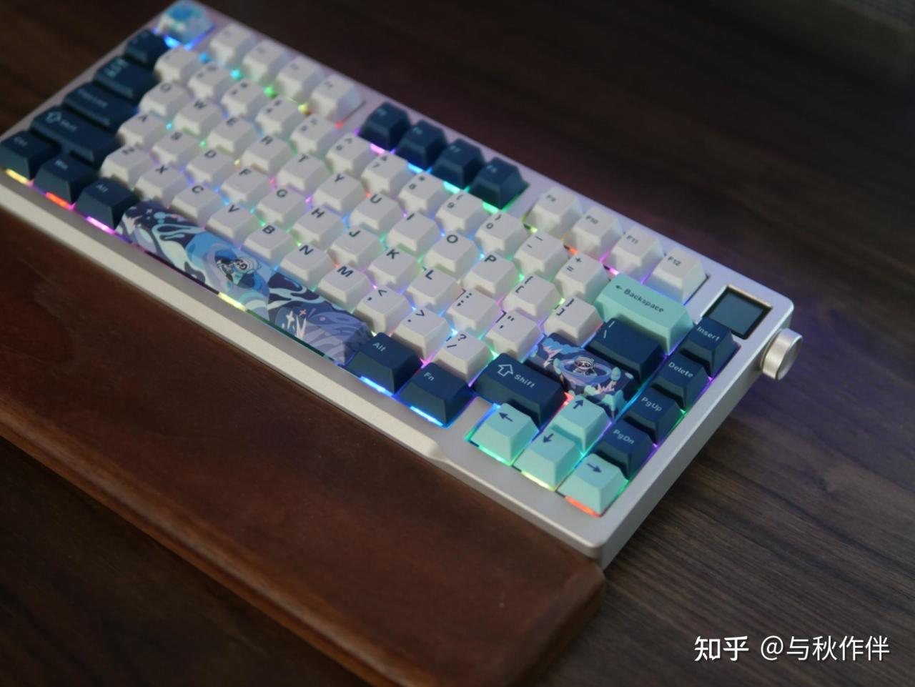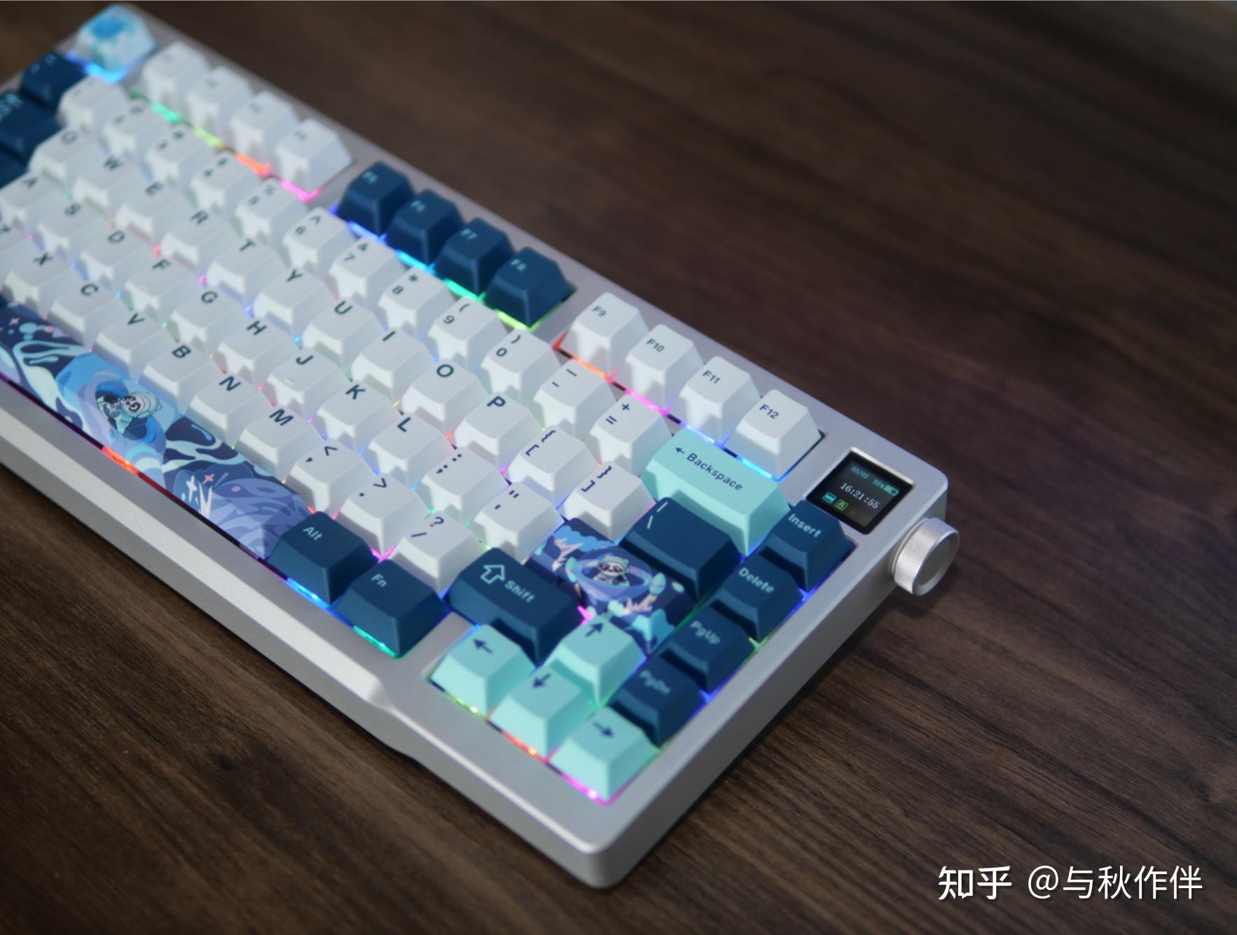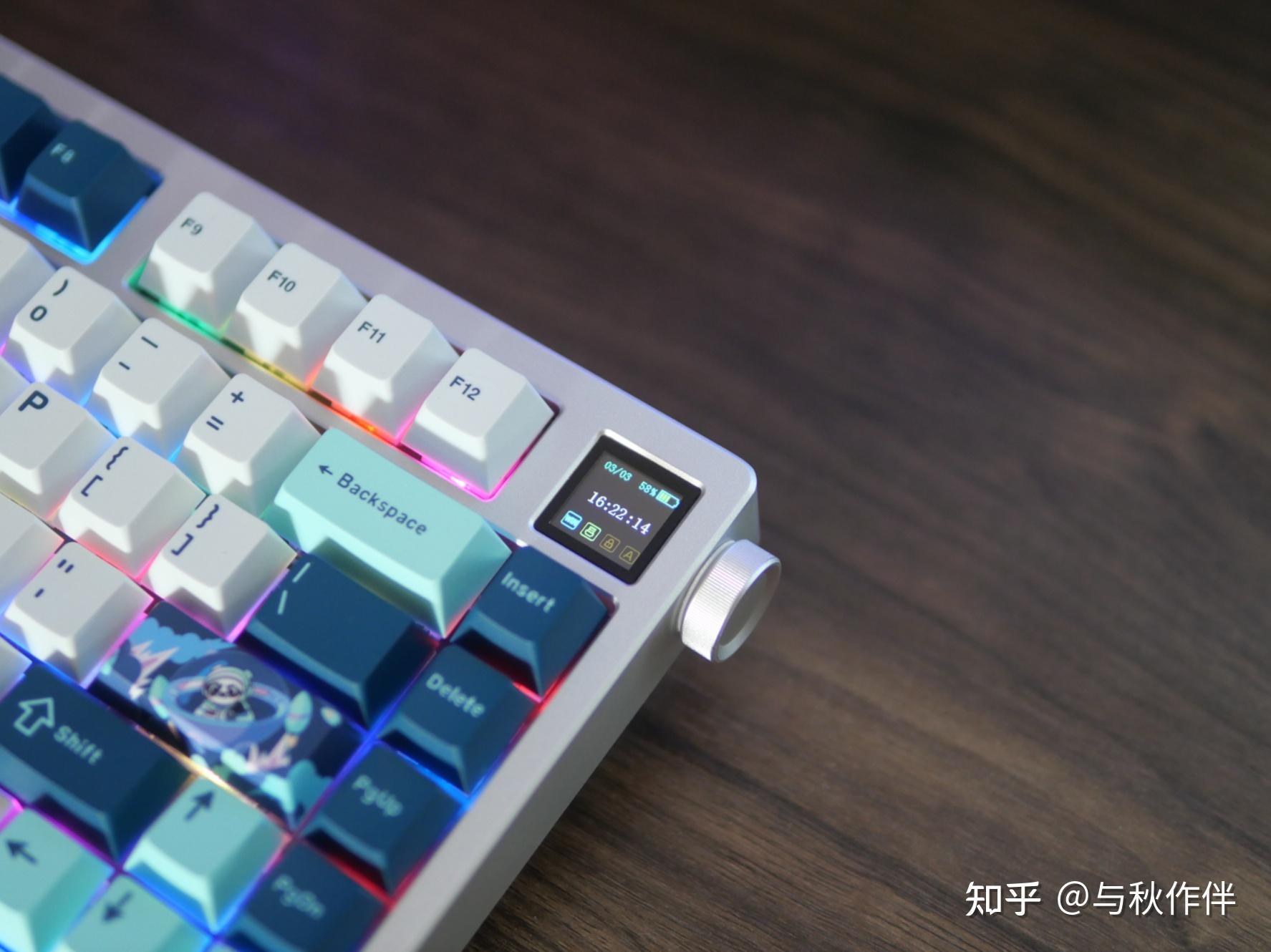 整把键盘是方向键不下沉的75%配列,方向键和主键区是连在一起的,左侧有一个可爱的小门牙设计。右上角则是一个彩色屏幕,可以调节灯光效果以及通过驱动设置显示自定义内容。