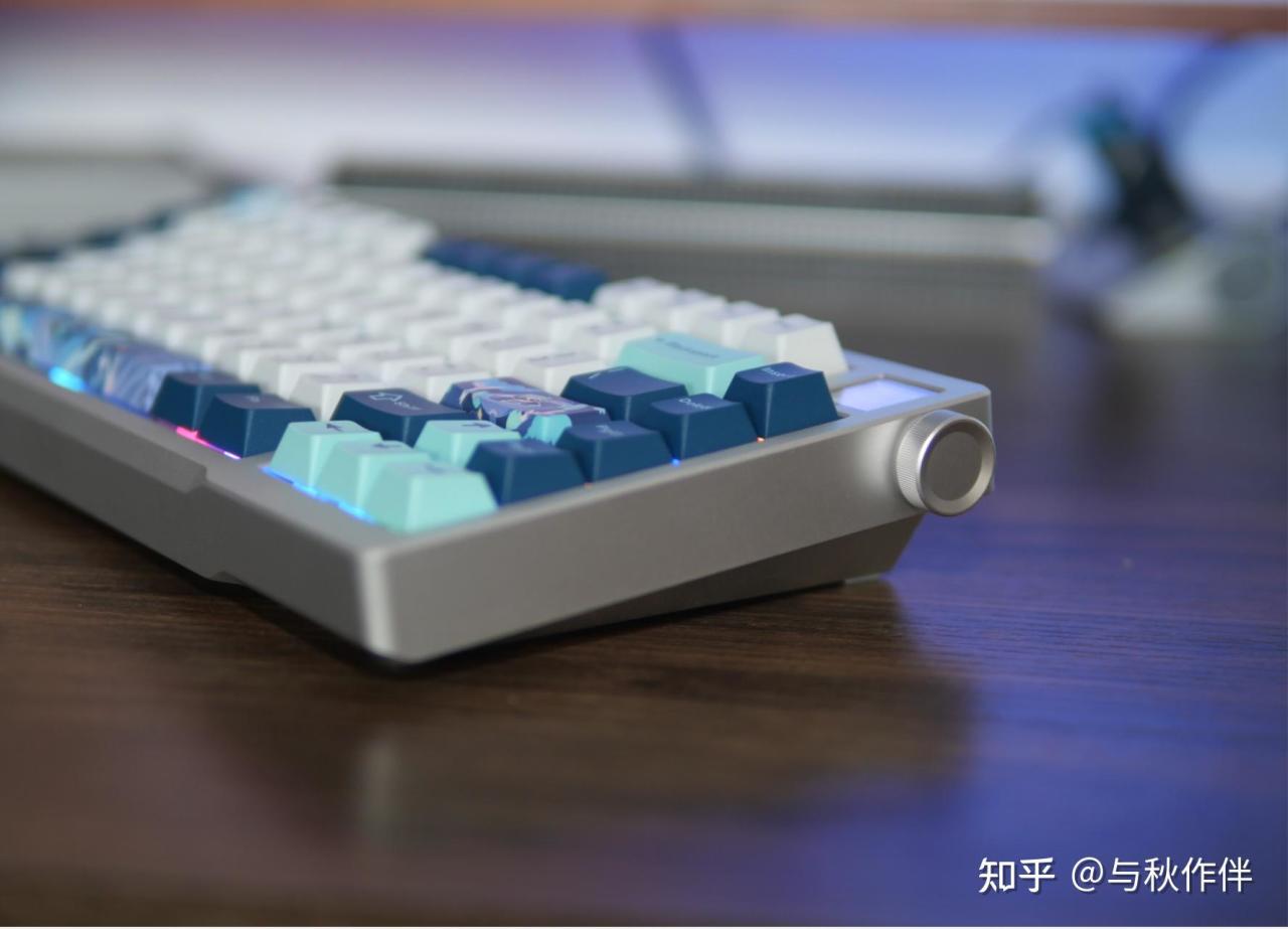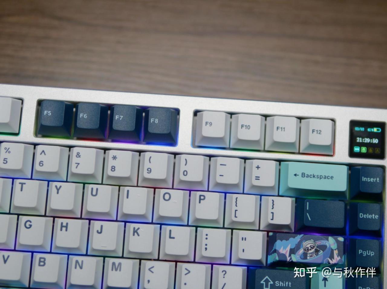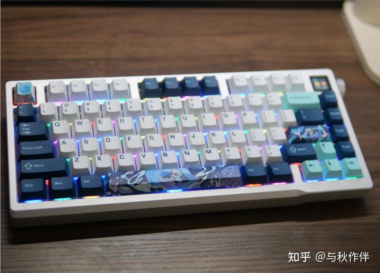整把键盘是方向键不下沉的75%配列,方向键和主键区是连在一起的,左侧有一个可爱的小门牙设计。右上角则是一个彩色屏幕,可以调节灯光效果以及通过驱动设置显示自定义内容。