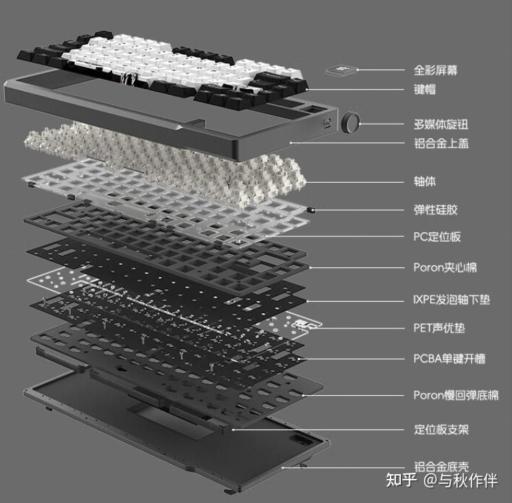 CNC全铝合金外壳、三模、板簧Gasket、PCBA单键开槽、下灯位RGB背光、热升华+二色PBT键帽、全键热插拔、右上角彩屏、金属旋钮。