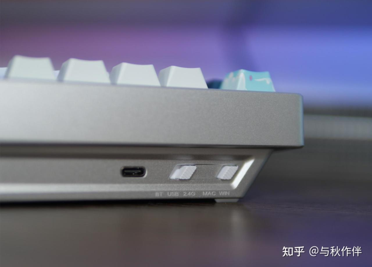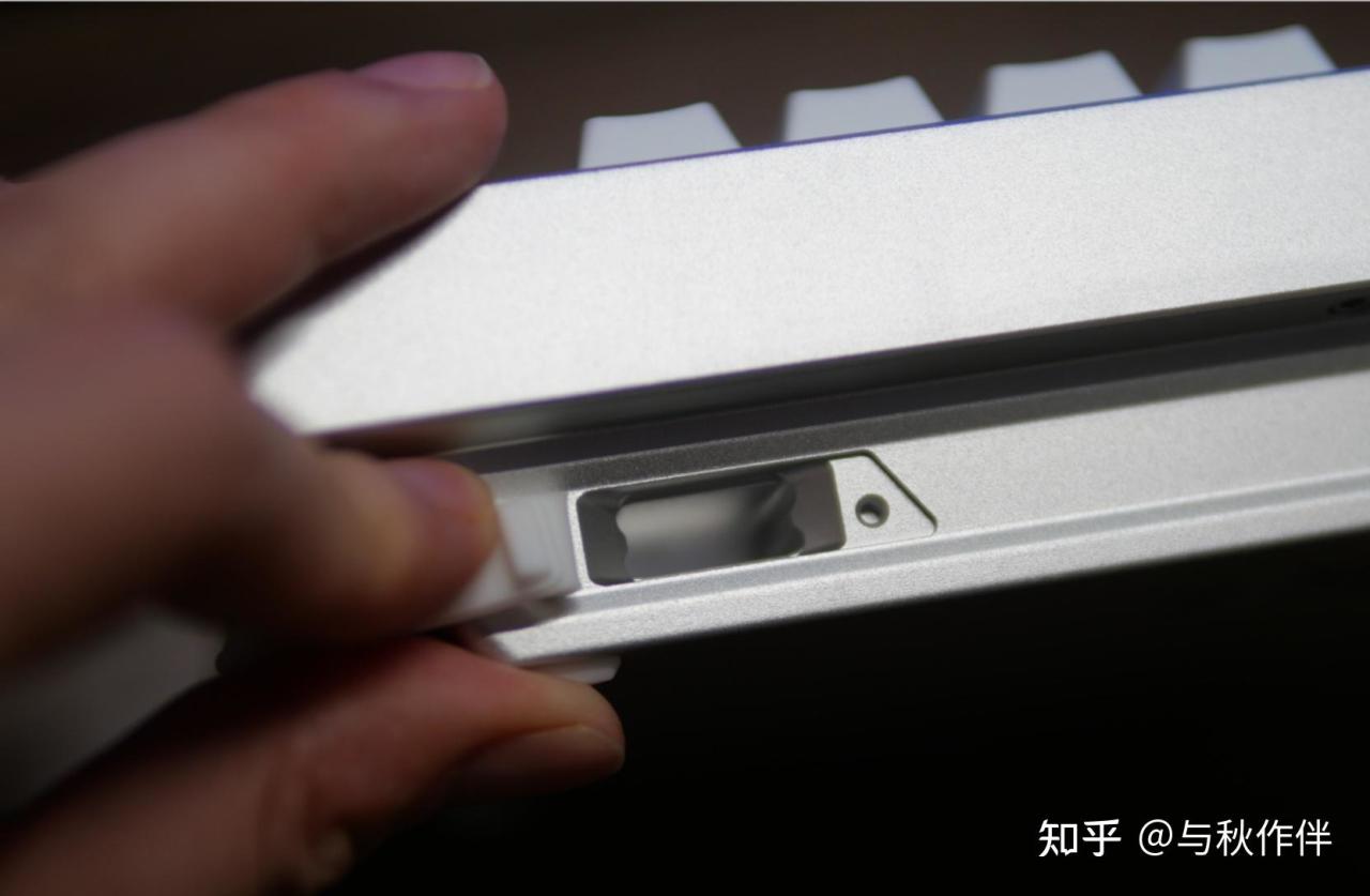 值得表扬的是这把键盘居然留有2.4G接收器的收纳仓,位于前面底部的位置,这在铝坨坨里算是非常少见的,毕竟铝块的加工没有塑料外壳那么容易,为了这个收纳仓需要在铝坨坨上专门开槽,不但需要有足够的空间,也会增加成本。可以看到这个槽开的还真的是挺规整的。