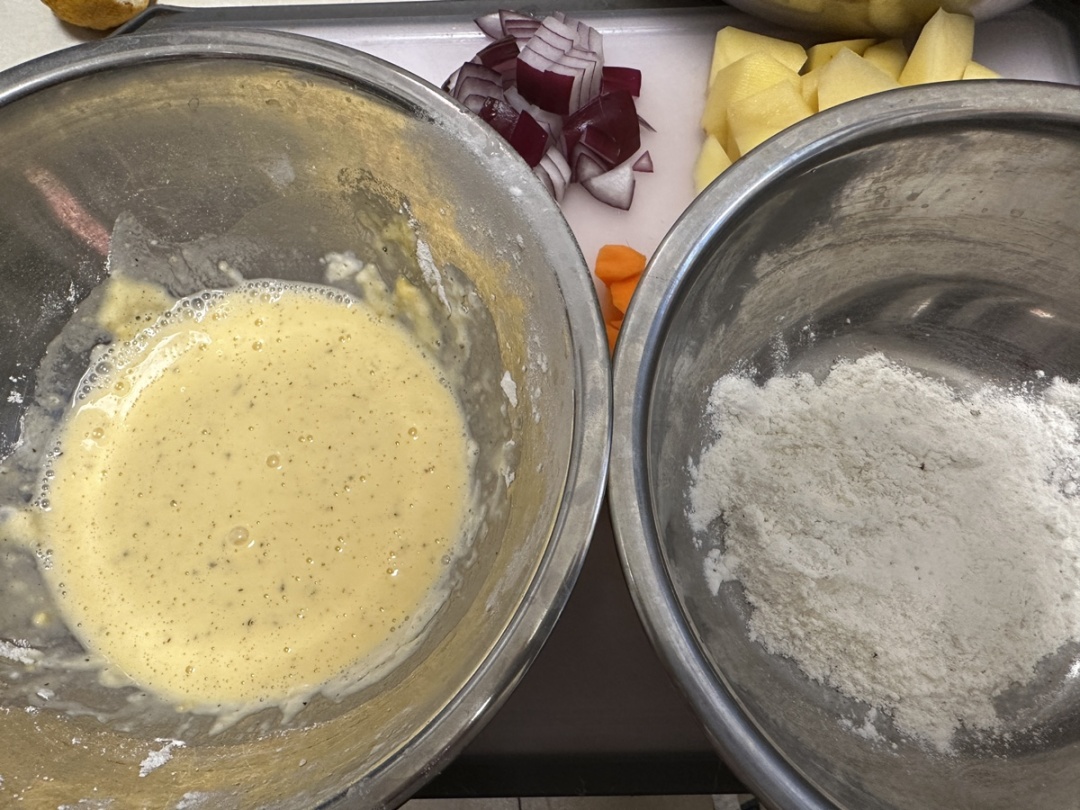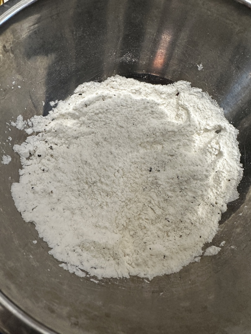 2.另外准备一个盆,放入淀粉40克、面粉80克、小苏打2克、盐2克、白胡椒粉2克、黑胡椒粉1克