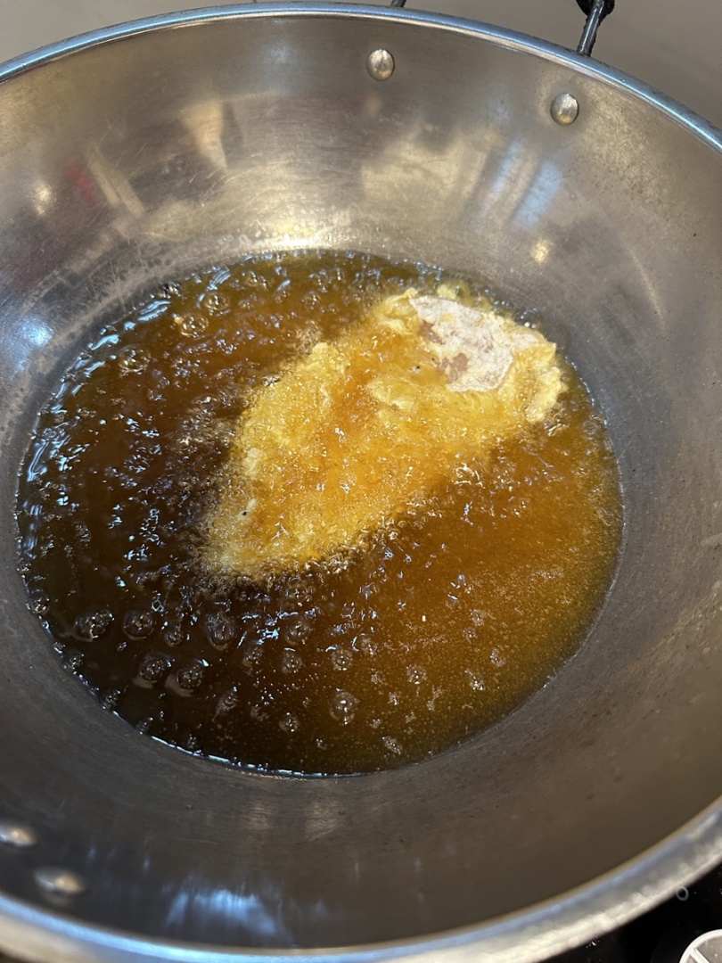 5.放入油锅开炸,鸡排放入后接着转小火,要不外面糊了里面还是生的