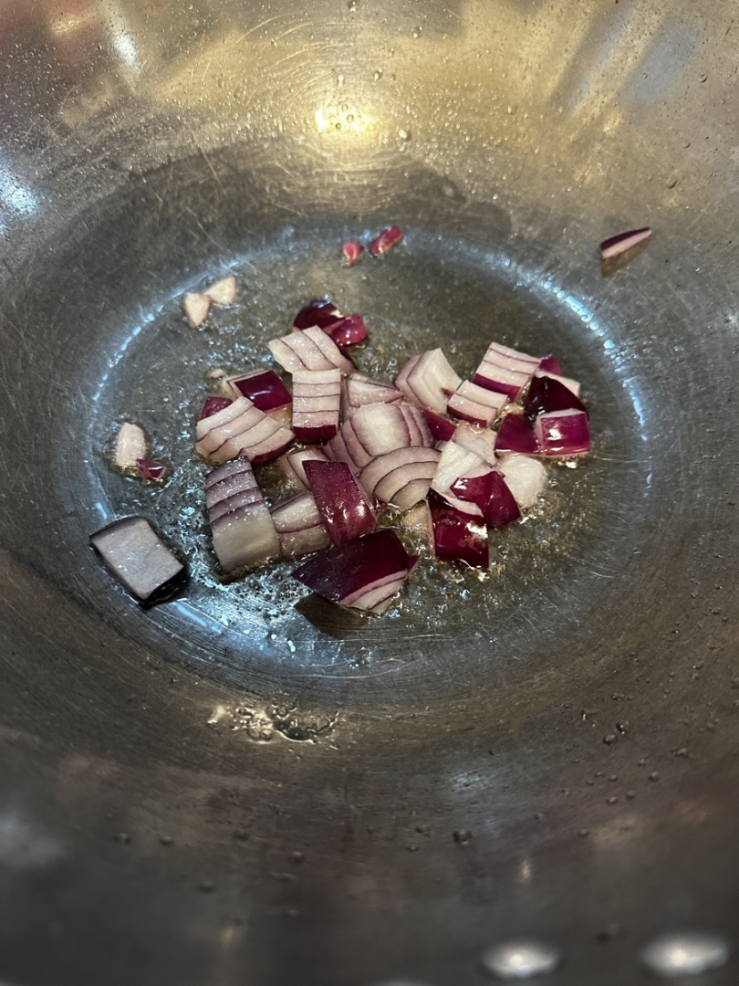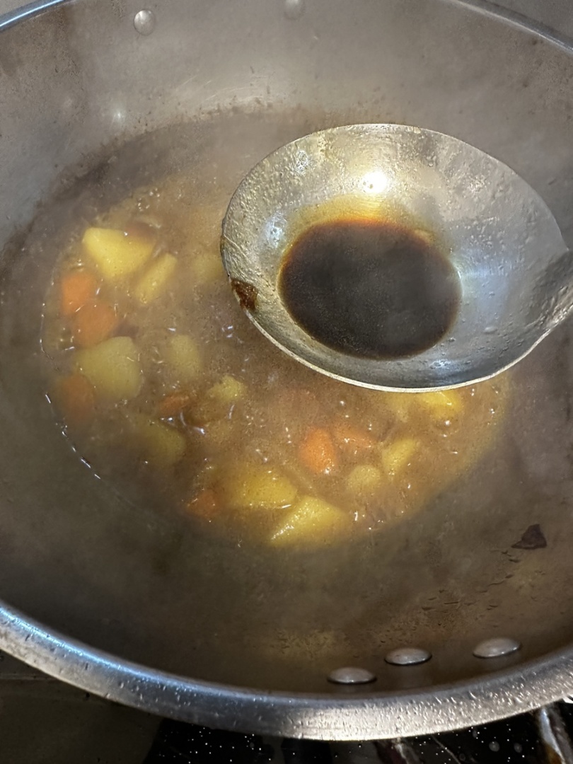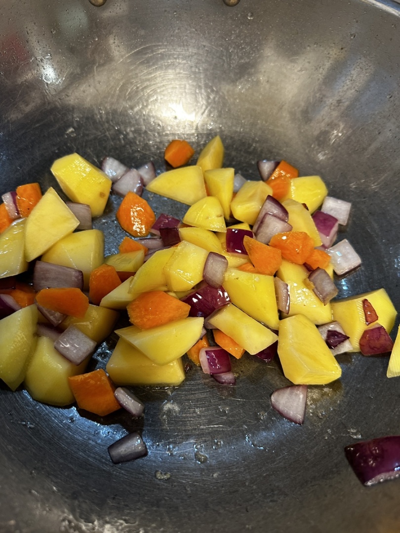 8.热油爆香洋葱后加入胡萝卜土豆翻炒均匀,之后加清水和咖喱块
