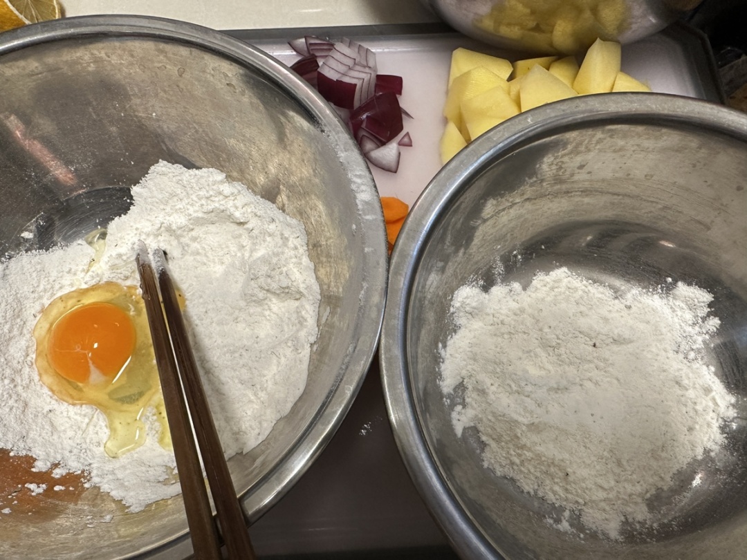 3.搅拌好的面粉分成两份,一份加入一个鸡蛋和适量水,搅拌成糊状