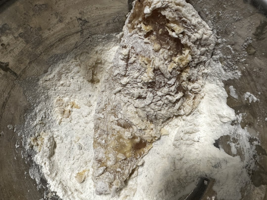 4.把腌制好的鸡排先裹面糊再裹粉,抖落多余面粉