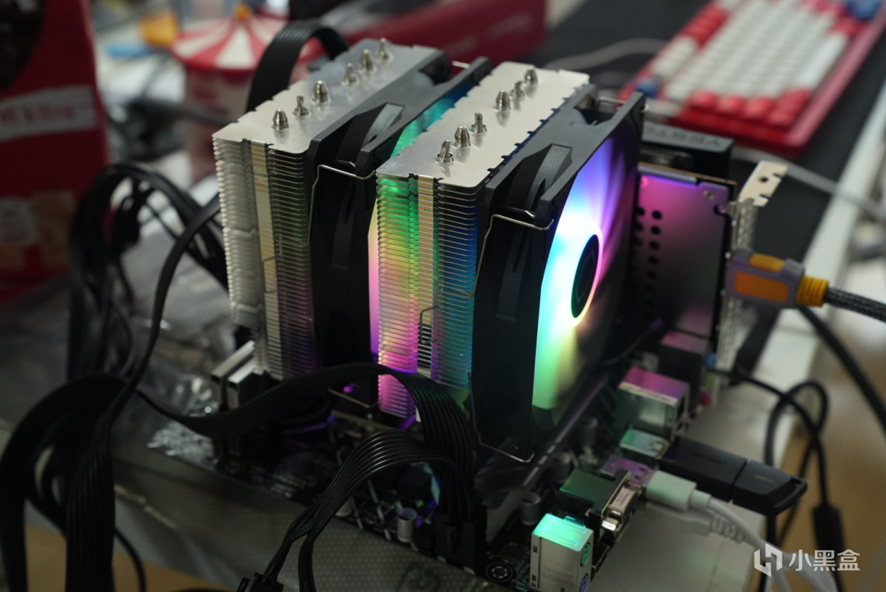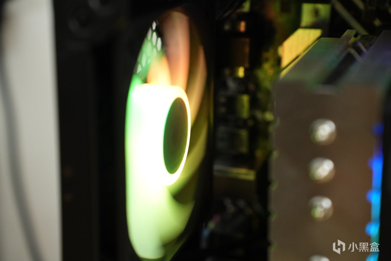 再就是最简单的装机环节了,这里我习惯是先把电脑的板子啊,u啊这些的先装一下,然后把系统装上,在统一的装机,可以看见,这两个120mm的散热风扇是真可以啊,看得起我的u起码还转了,rgb氛围也挺浓郁的。