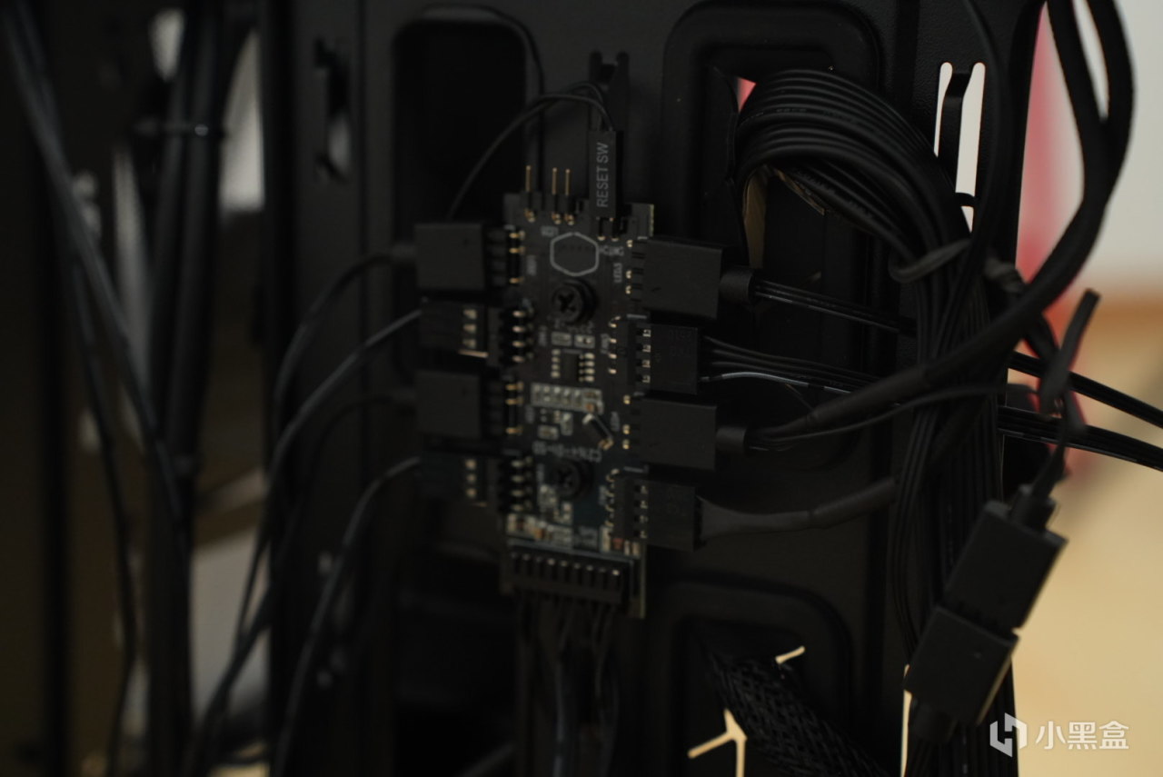 机箱背面理线的位置,有一个散热器的HUB,这个HUB可以控制机箱的整体灯的颜色啊,亮度啊,这种的,这对于我家里的那个机箱来说简直是完全升级啊,派小星进大观园啊,全是新奇玩意,真不错。