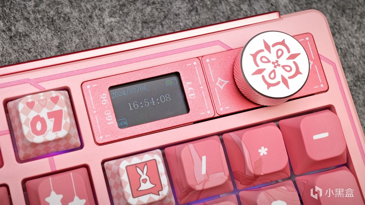 屏幕方面爲一塊TFT彩屏,支持時間顯示、調節燈光、自定義GIF動圖等多個功能,在默認的時間狀態中還可以起到鍵盤指示燈的作用,可以清晰的看到當前大致電量、鏈接模式、按鍵鎖等多個狀態。不過由於屏幕和旋鈕模塊並不是固定在上蓋處,所以從圖中也可以看到有一些縫隙。