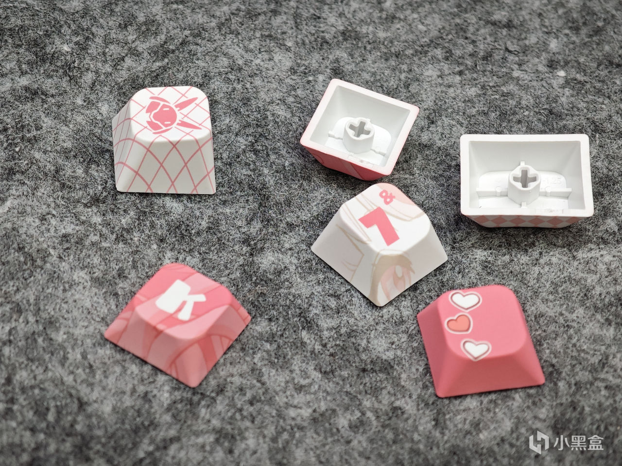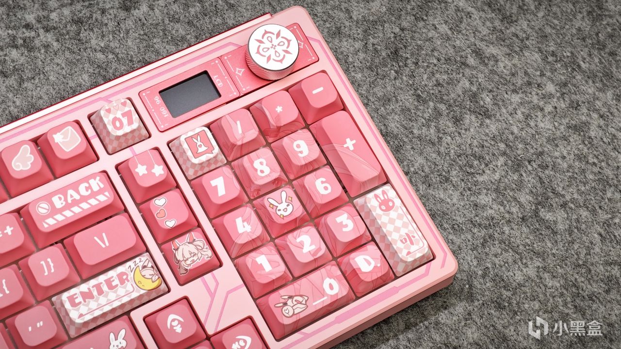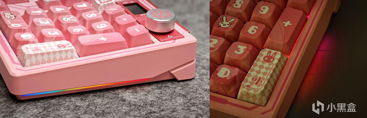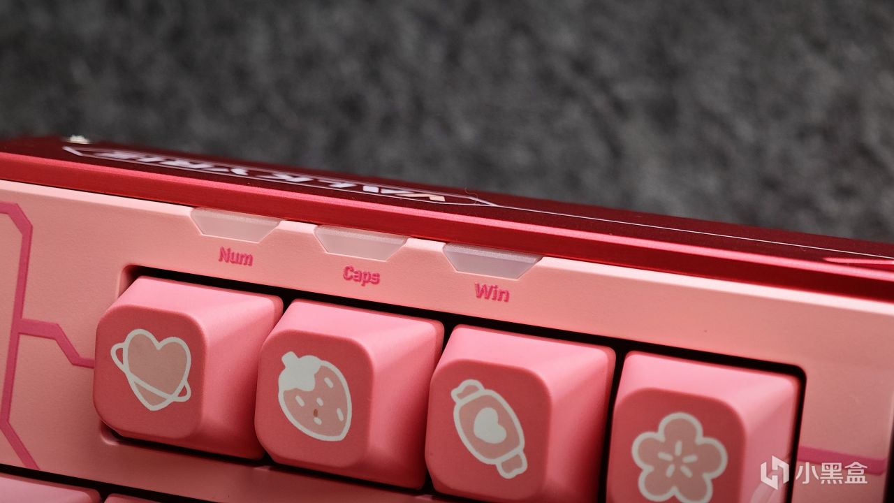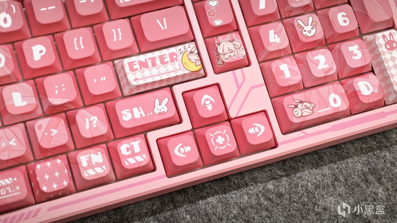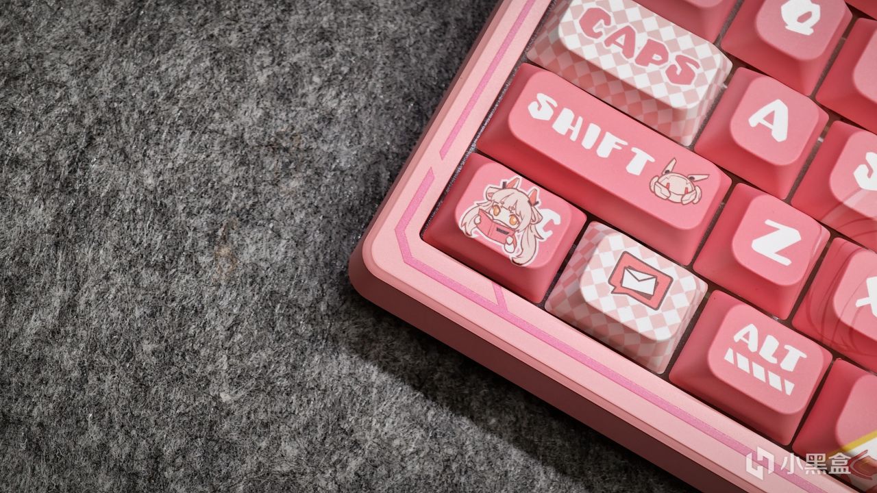 和前代的IP版本一樣,這次的呂卟版本鍵帽同樣採用隱藏人物的形式,但有所不同的是這次的風格會更加偏“卡哇伊”一些,整體無論是顏色還是字符,都能感覺到滿滿的可愛風,試問哪個猛男可以拒絕這麼粉嫩的鍵盤?反正我是不行。