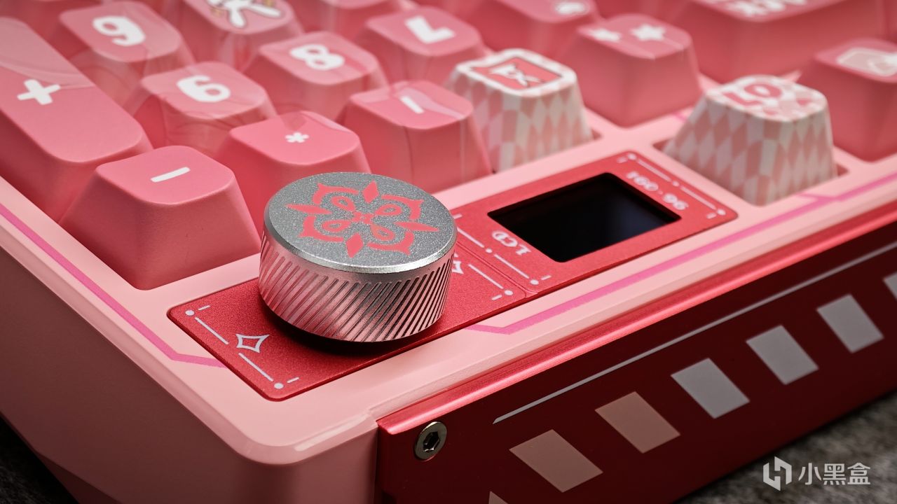 在旋鈕部分,可以看到採用的是金屬的D口旋鈕,在旋鈕側邊有着大量的防滑紋設計,即使是單手使用也不會因爲滑導致旋鈕不動,在上方還選擇了和這次主題很搭配的花紋。下方和隔壁的屏幕部分有做單獨的區分,和整個按鍵區域有很明顯的區域劃分。