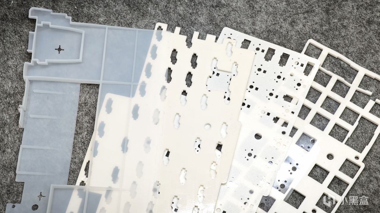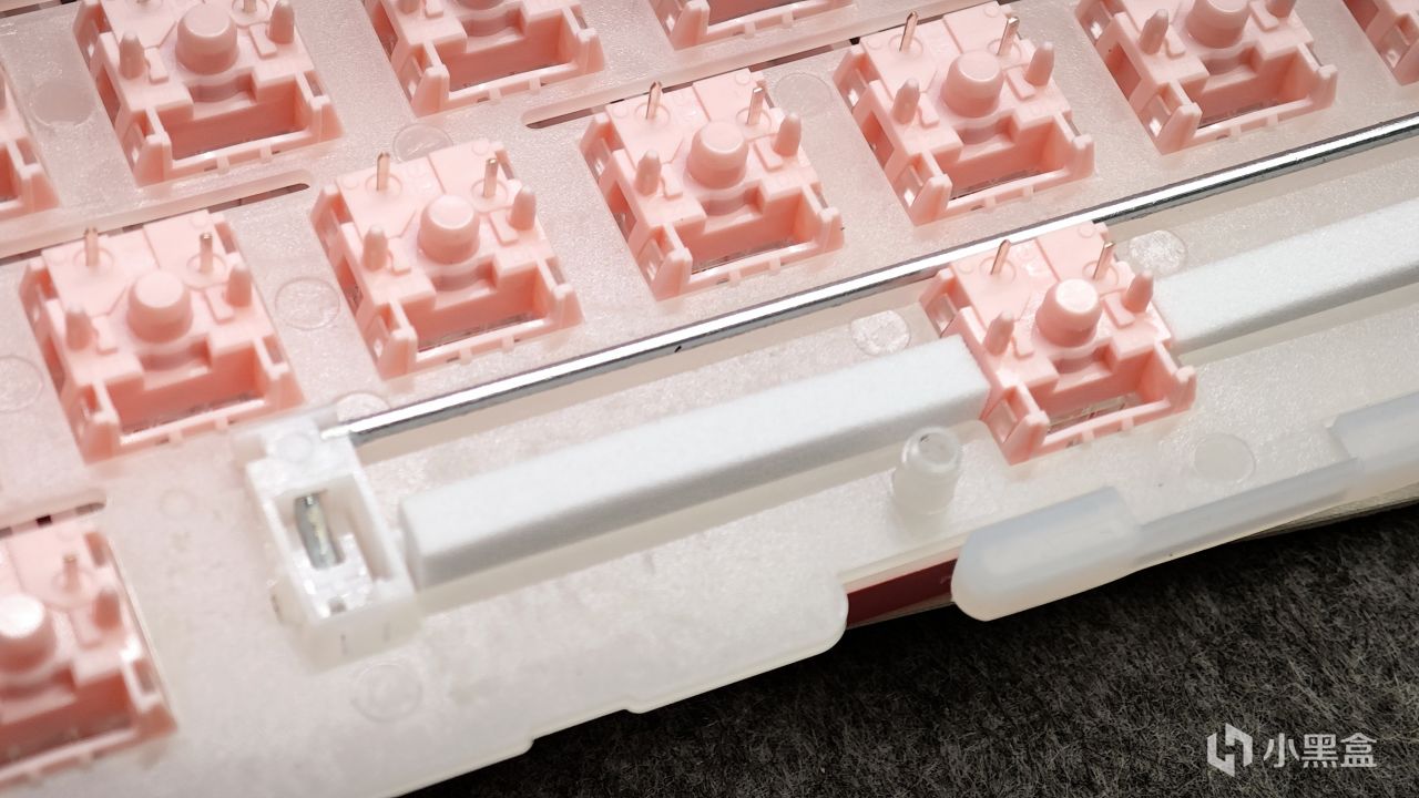 定位板採用的是當前比較主流的PC定位板,同時採用橫向的開槽方式,可以略微增加鍵盤整體的軟彈程度,同時不至於太過軟從而導致難拔軸、插軸。