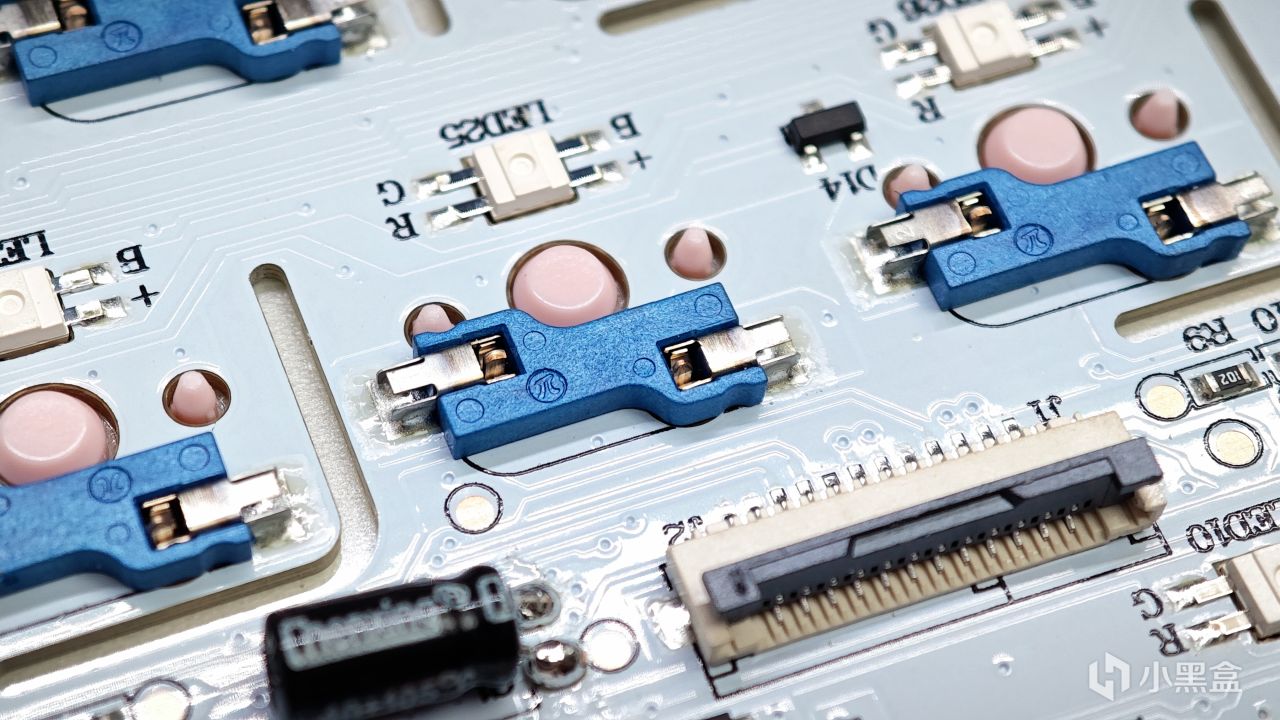 再就是前面說過的防漏光設計,在定位板對應指示燈的位置,添加了一塊黑色貼紙,可以有效的吸收周圍的光,不會讓指示燈的光透過來,不過在側邊的氛圍燈上並沒有添加,因此有些漏光。