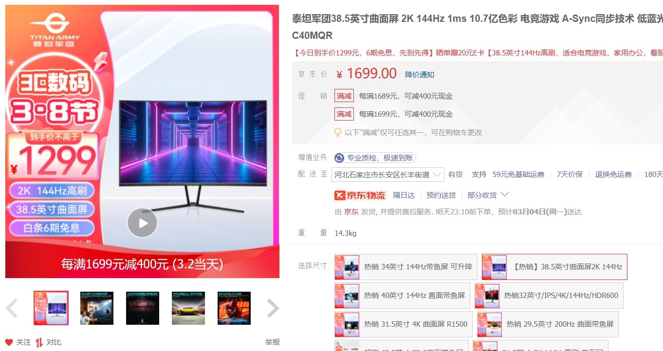 与舍友打PUBG,总被挖苦说是“人体描边大师”,所以下决心换掉手头正在用的27寸显示器。原本想升级到32寸看得更清楚一些,但在京东看到泰坦军团C40MQR时,我的想法产生了动摇。38.5意味着它的显示面积是27寸的整整两倍,而144Hz,就意味着它是为电竞而生!于是,就有了今天与小伙伴们的分享!