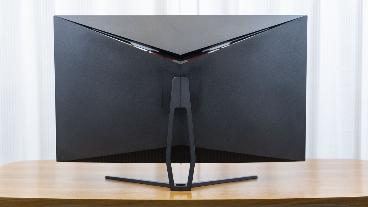 从背面来看,它身后有两个RGB灯带,看起来总有些高达的样子,中间为全金属的显示器支架。当然了,这款显示器确实因为尺寸的原因有那么一丢丢重。
