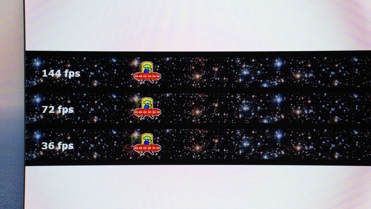 之后是144Hz,我们打开TESTUFO进行测试,这个时候我们可以看到,小飞碟在144Hz之下,能够顺畅、清晰且快速的移动,很稳的!另外,144Hz也是当下电竞显示器的主流水平完全可以满足FPS游戏的使用。