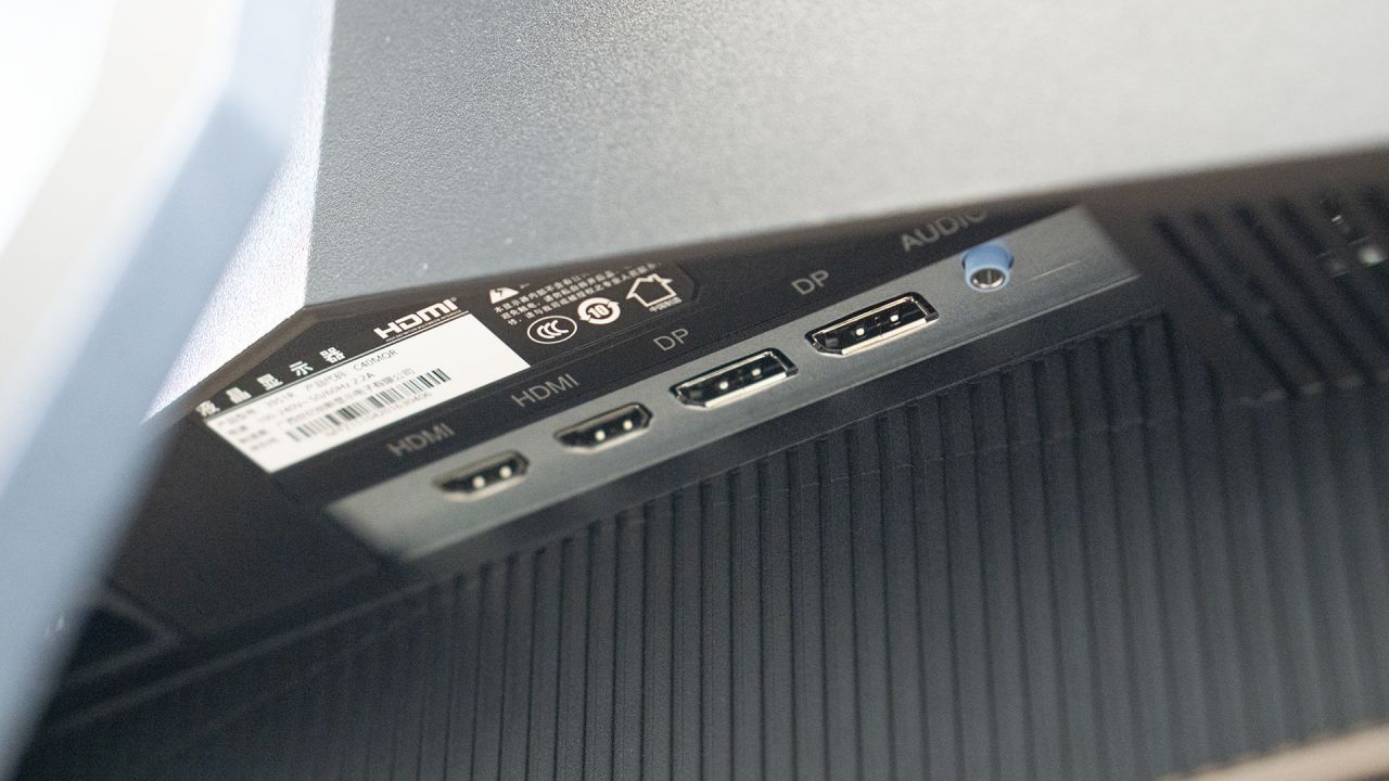 底部分布着两个HDMI2.0、两个DP1.4和一个音频输出口。对于驳接PC或其它家庭娱乐设备来说,那是绝对够用的。