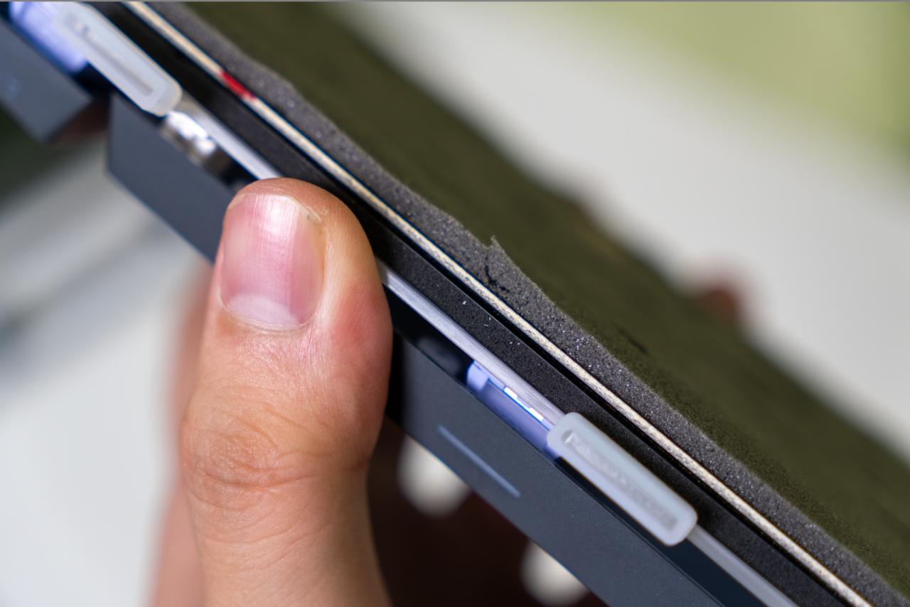 在键盘侧边也是目前半铝键盘的一个难点,因为铝材和塑料两种材质的色差和接缝,导致键盘的侧面观感有些撕裂。上面这两点都是半铝键盘目前的通病。就算是ROG夜魔也有同样的问题。