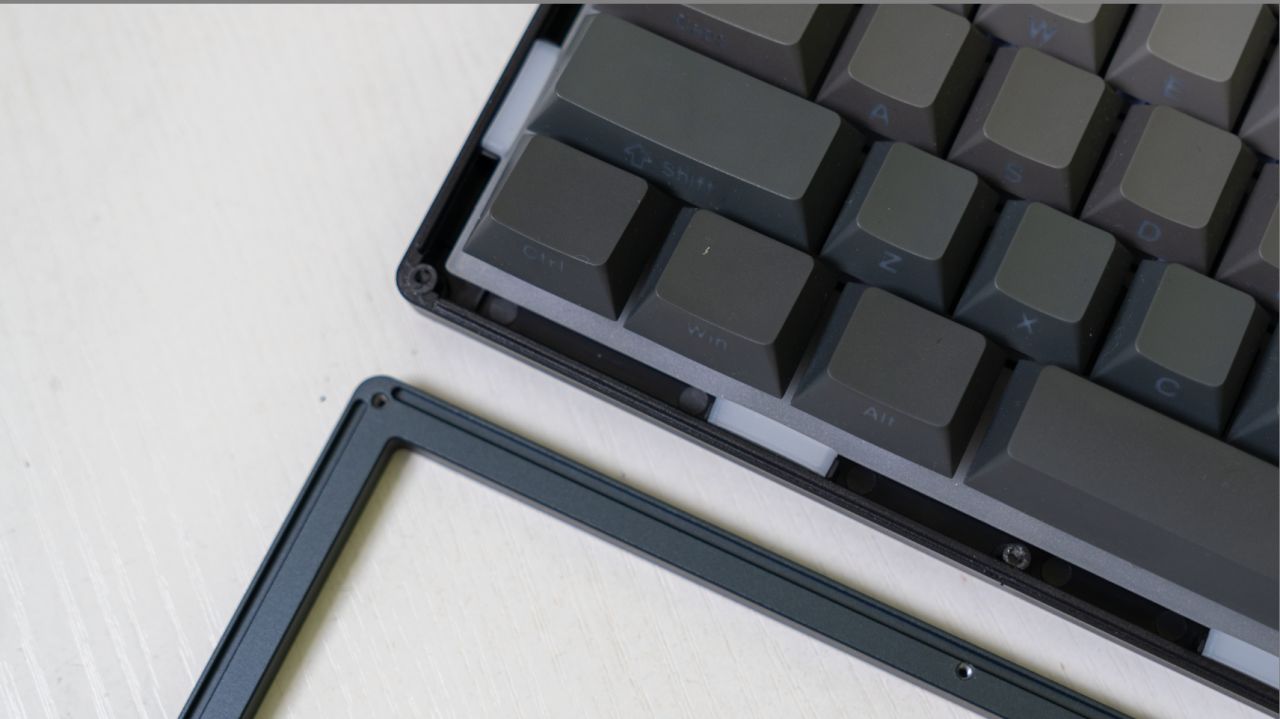 最后来看拆解,键盘采用了半铝上盖。所以固定方式也参考铝质键盘采用螺丝固定。