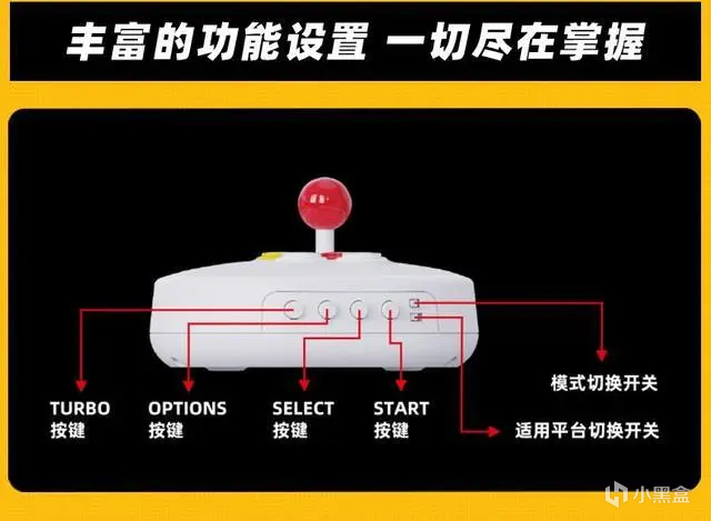 右侧是主机功能键:依次是连击、设置、选择与开始,还有主机与摇台的切换和摇杆的三种模式切换(1默认模式、2十字键、3方形摇杆)