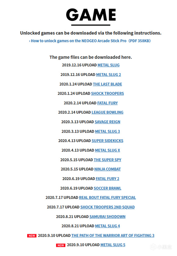 主机模式(亮蓝灯):随机体带了20款游戏,都是格斗游戏,分别为:拳皇95—22(无96与21)、饿狼传说系列、侍魂系列、月华剑士、世界英雄系列、龙虎之拳、风云等20个,打了补丁能解锁圣诞版多20个横版过关和体育游戏,为合金弹头系列等游戏,听说能刷机当模拟器玩7000个游戏但会卡,本人没有操作。