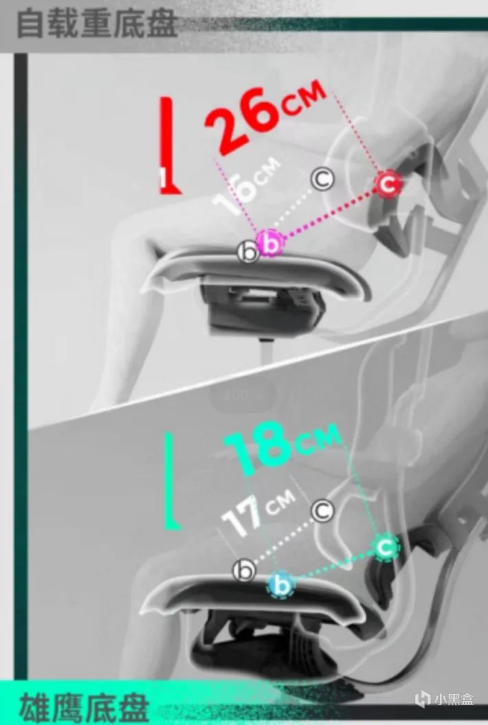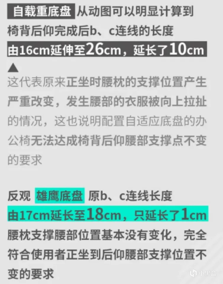 自載重底盤從圖可以計算出椅背後仰完成後b、c連線的長度,由16cm延伸至26cm,延長了10cm,這代表原來正坐時腰枕的支撐位置產生嚴重改變,發生腰部的衣服被向上拉扯的情況,同時也說明配置自適應底盤的辦公椅無法達成椅背後仰腰部支撐點不變的支撐需求;反觀雄鷹底盤原b、c連線長度由17cm延長至18cm,只延長了1cm,腰枕支撐腰部位置基本沒有變化,完全符合使用者正坐到後仰腰部支撐位置不變的要求。