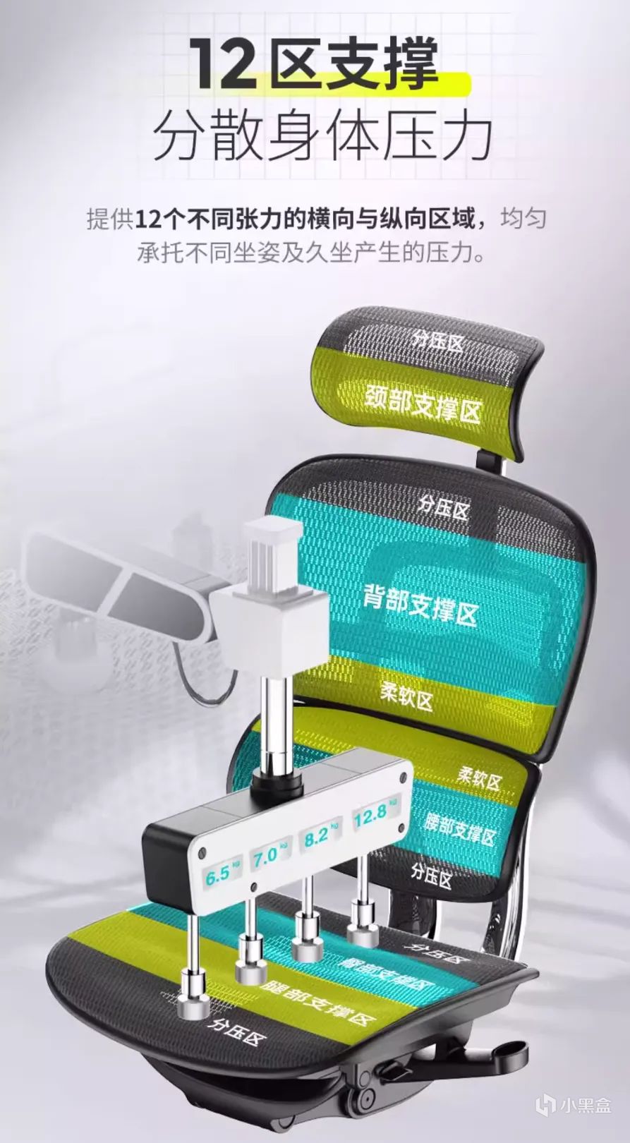 整把椅子的頭枕、靠背、腰枕和坐墊通過設計,分成了12個受力區域,每個區域會對應使用者不同的身體部位給到不同的支撐力,讓身體接觸座椅的每一個位置都能支撐力與舒適度恰如其分