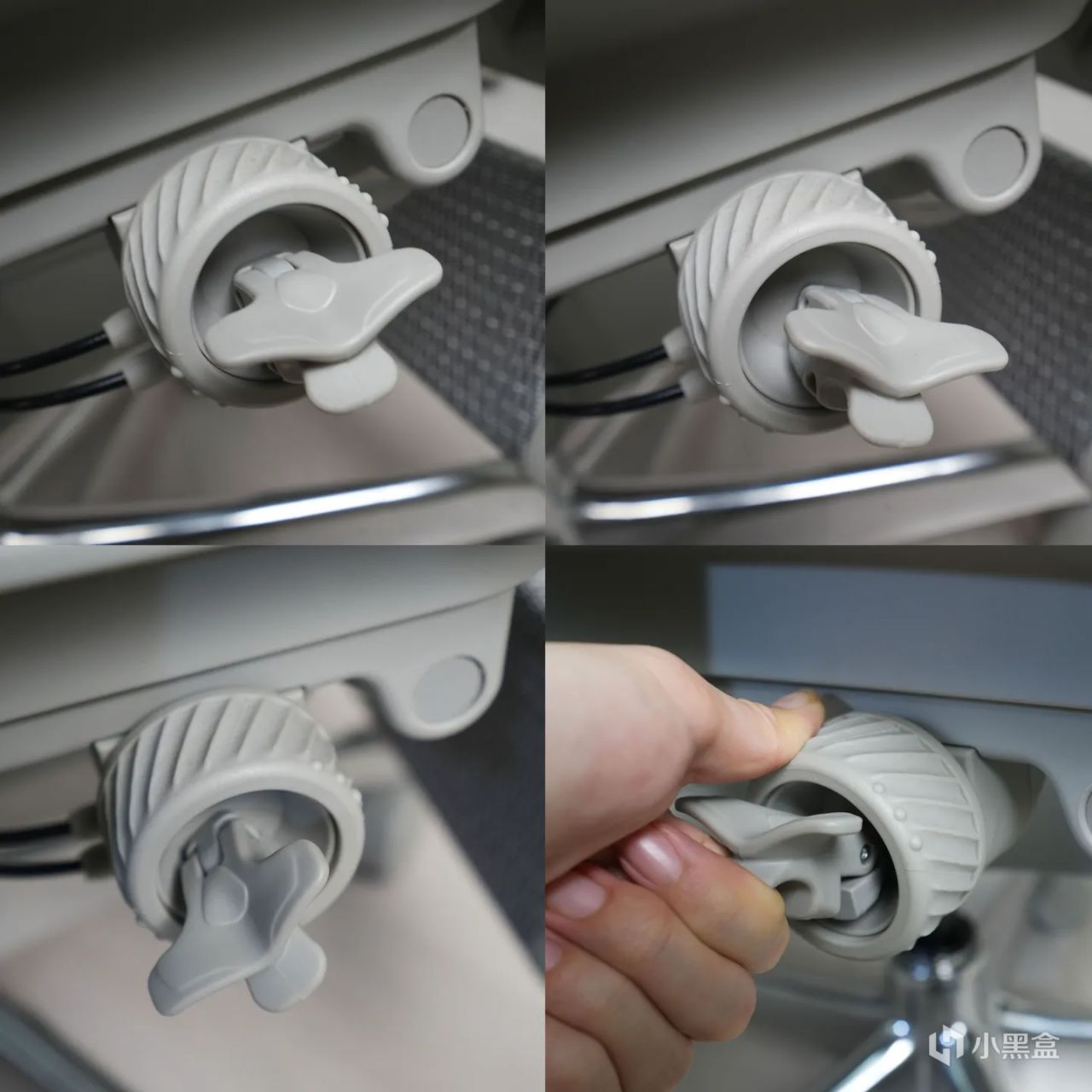 爲什麼穩固呢?首先抓着椅身整體晃動時,很穩,不會有散架的感覺。之前用過幾把自己組裝的工學椅,多少還是會晃,在椅子上做大幅度動作時也會有少許雜音。其次是各功能部分的鎖定比較清晰穩固,晃動感小。