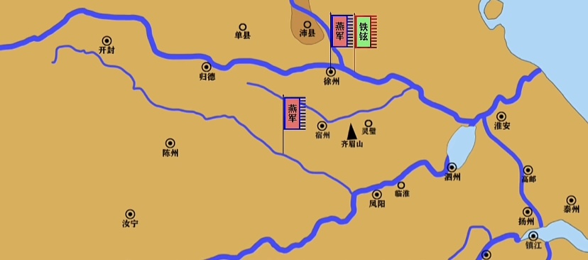燕军顺势继续南下于5月7日攻克泗州,盛庸见状于淮河建立防线以阻挡燕军继续南下,