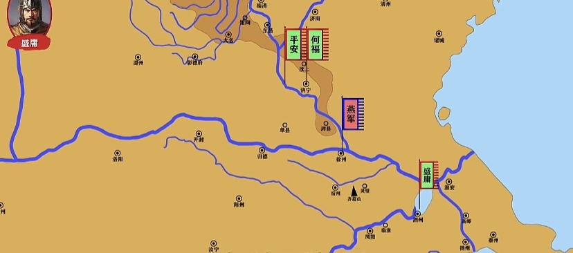 与此同时,何福、平安等将进驻济宁,盛庸则率军进抵淮上,