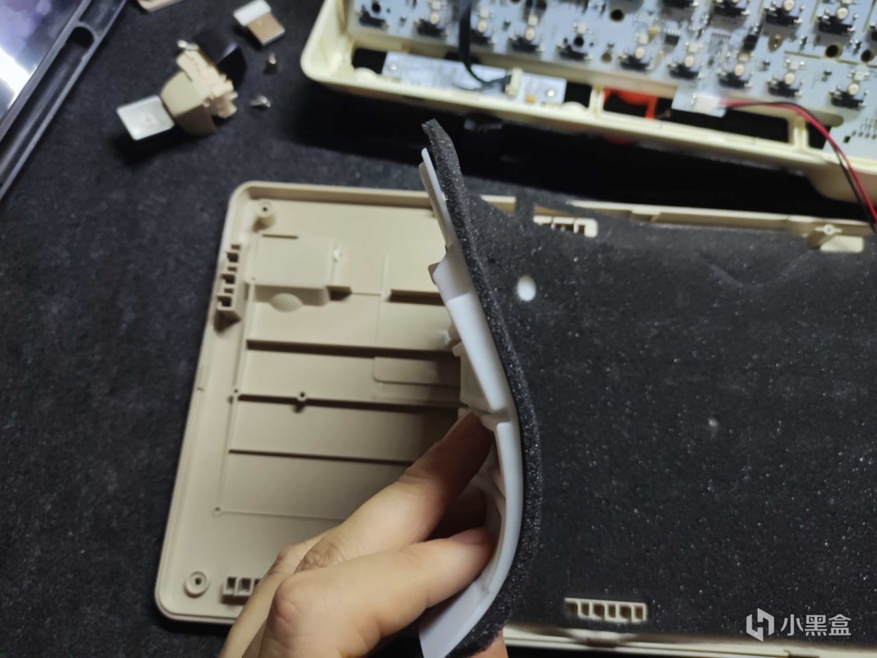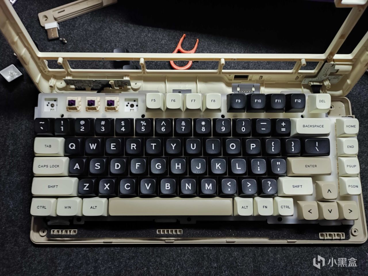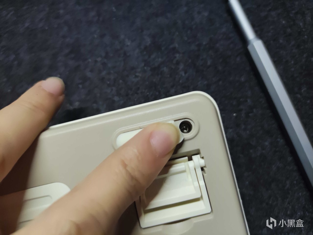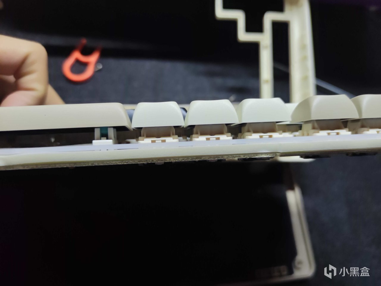 然后玩家从下方的两个脚撬,即可撬开键盘的上盖,如果想要取下来,建议想去掉上面功能区的一排键帽。