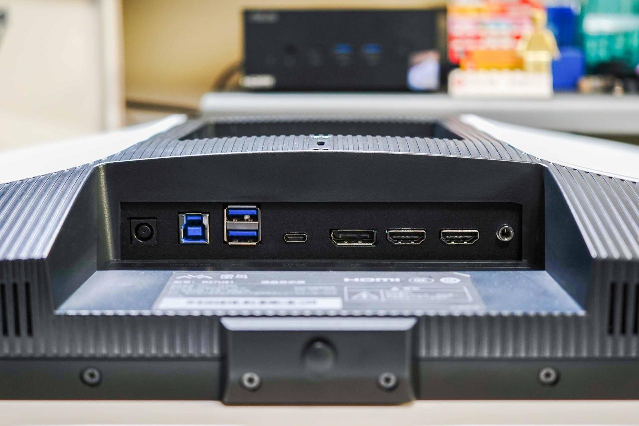 ● 输入接口包含DP1.4*1、HDMI2.1*2以及支持90W反向供电的Type-C接口,音频接口为3.5mm*1和一对内置的3W扬声器,操作接口包含USB3.0-A*2和USB3.0-B*1。