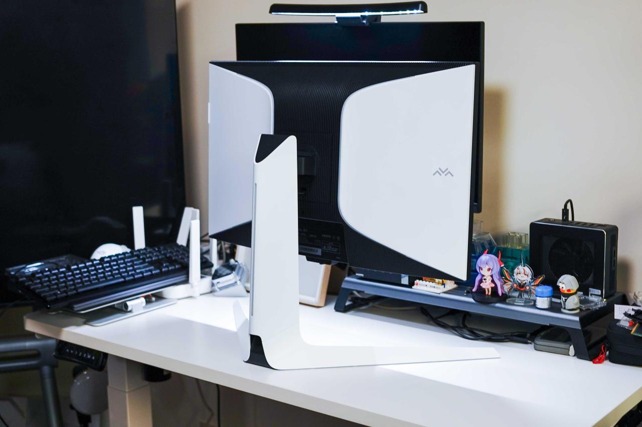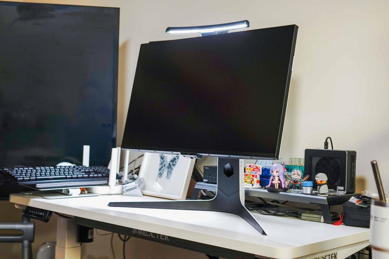 显示器背部有两条RGB灯带,连通主机工作时会呈现流光溢彩的灯效,支臂中间同样有一条,在夜晚暗光环境使用非常有氛围感。