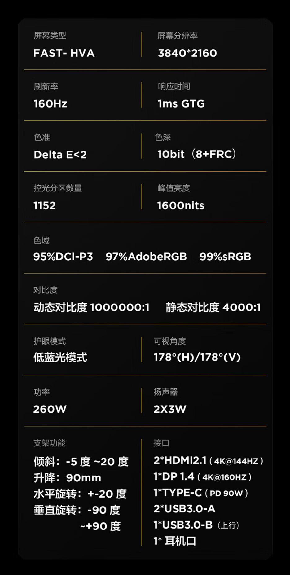 ● 显示分辨率为3840*2160(4K),控光分区为1152个,峰值亮度为夸张的1600nit,支持HDR1400,动态对比度为1000000:1,静态对比度为4000:1。