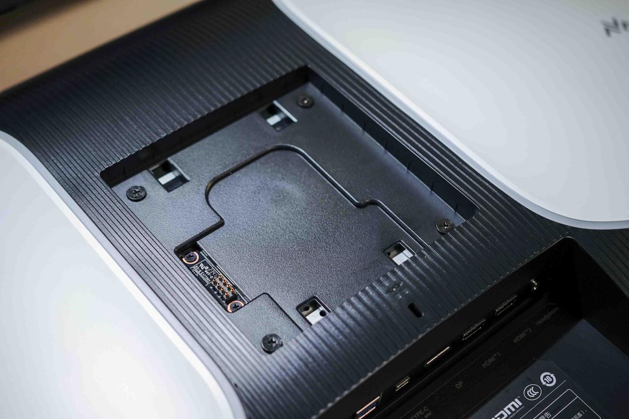 雷鸟U8显示器原生支臂接口为100*100的VESA标准,主流第三方支臂都可以直接安装,槽位深度也比较浅,不需要上额外定位柱。