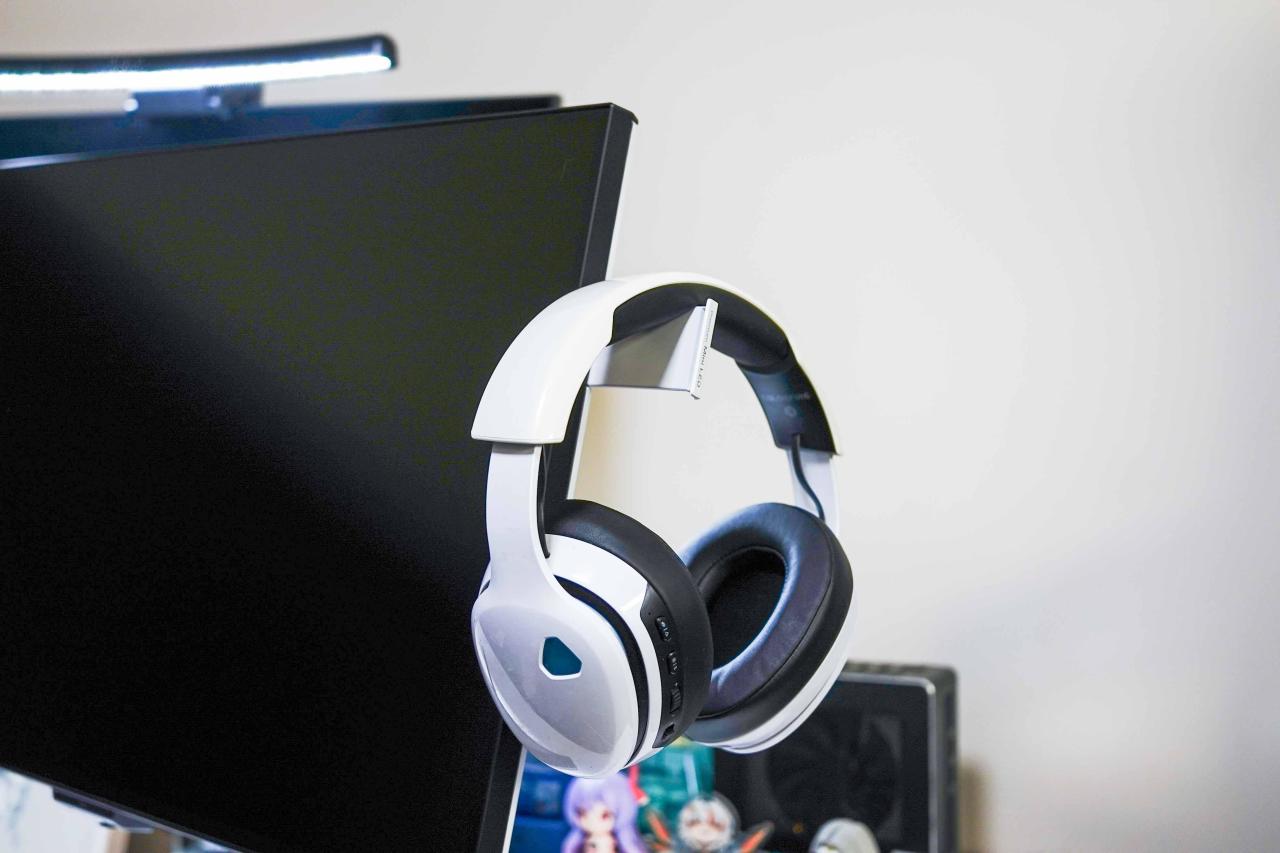 耳机挂架被设计在屏幕的右上方,平时不用时可以隐藏收纳,拿取还是比较方便的,耳机充电线可以通过背部绕至下方走线孔隐藏起来。