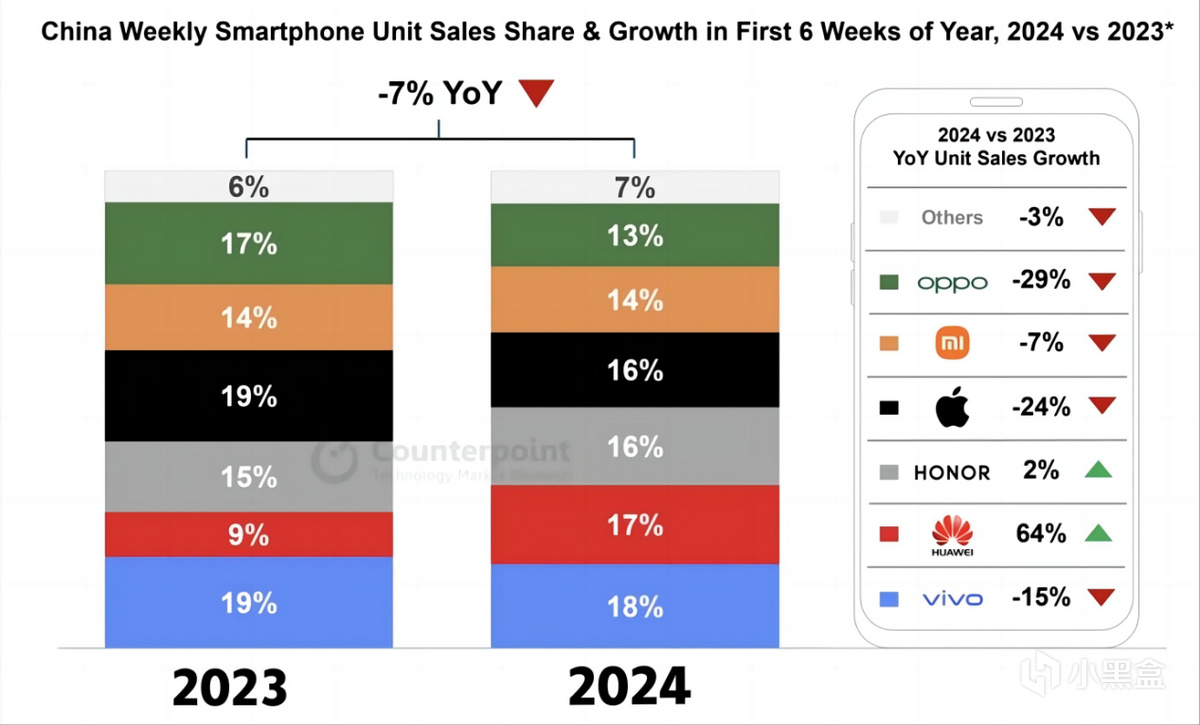 “屋漏偏逢连夜雨”,欧盟的罚款还没交上,2024年国内前6周市场份额出炉,苹果市场份额大降24%,而华为却大涨了64%,不可谓不惨。为了保住销量,苹果不得不降价,iPhone15系列全系降价1000以上,售价来到5000内,其他产品也开启了降价模式,对于苹果而言,确实少见。