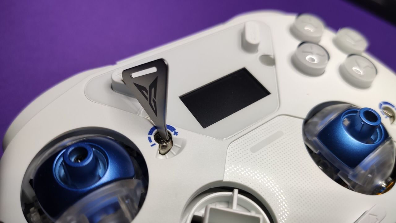 打開磁吸面板後,能夠看到內部的合金軸承結構,內置的高速軸承顯著減少了間隙和摩擦,實現超絲滑不卡澀的操作體驗,右側還利用磁吸設計隱藏了一個調節阻尼的“小起子”,在飛智創新的外置彈簧設計,能夠做到搖桿力度無級調節,滿足各類遊戲和操作偏好。
