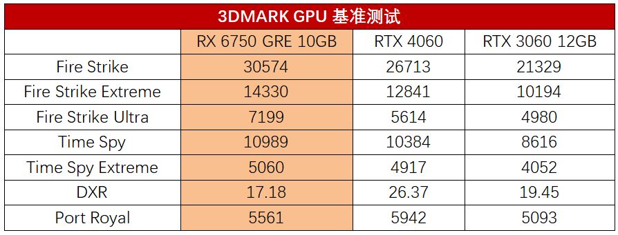 3DMARK GPU基準測試中,RX 6750 GRE 10GB在FireStrike系列測試中最高領先RTX 4060約28%,平均領先約18%,而對比RTX 3060 12GB,平均領先幅度則達到了約43,最高領先45%以上。DX12的Time Spy系列測試中,RX 6750 GRE 10GB平均領先RTX 4060約4%,領先RXT 3060 12GB約26%。在針對光線追蹤的DXR測試中,RX 6750 GRE 10GB分別落後RTX 4060和RTX 3060 12GB 35%、12%,Port Royal測試中,RX 6750 GRE 10GB落後RTX 4060 6%,領先RTX 3060 12GB 9%。