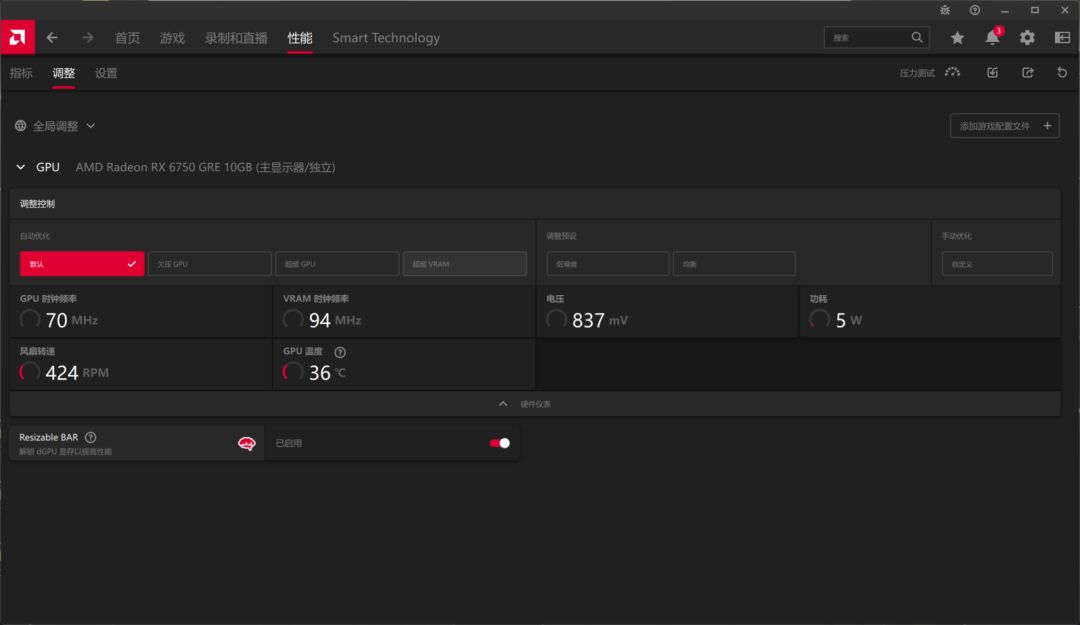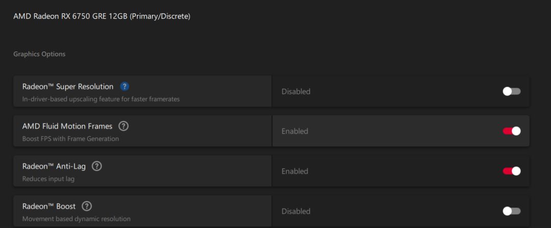 除了FSR 3技術之外,RX 6750 GRE 10GB還支持AMD AFMF幀生成功能,並且由於AFM集成在顯卡驅動中,可以讓許多暫未支持FSR 3的遊戲也能開啓幀生成,從而大幅提升遊戲性能,目前AFMF已經在正式版驅動上實裝了。具體的操作很簡單,打開AMD顯卡驅動程序,在“遊戲”標籤頁面下,選擇“顯卡”界面的“自定義”按鈕,然後界面中就會顯示有“AMD Fluid Motion Frames”的選項,點擊即可開啓。