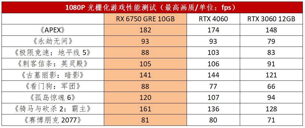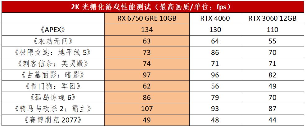從幀率上來看,RX 6750 GRE 10GB在1080P分辨率下,其平均遊戲幀率超過了100fps。2K分辨率下,除了《賽博朋克2077》,都可實現60fps以上的流暢幀率。而RTX 3060 12GB在2K分辨率下有3款遊戲的幀率都在60fps以下,遊戲性能明顯超過RTX 3060 12GB。對比RTX 4060也互有勝負,在參測的幾款遊戲中,RX 6750 GRE 10GB的優勢甚至更大,遊戲性能表現非常不錯,考慮到兩款顯卡的價格差異,更凸顯了RX 6750 GRE 10GB的性價比。