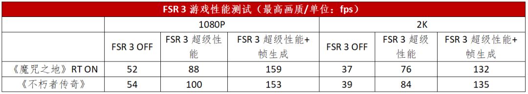 接下來,我們在支持FSR 3的兩款遊戲《魔咒之地》和《不朽者傳奇》中進行了測試。在1080P分辨率下,《魔咒之地》《不朽者傳奇》兩款遊戲的FSR 3+幀生成的幀率提升分別爲206%、183%。在2K分辨率下,《魔咒之地》打開FSR 3超級性能模式後幀率從37fps提升到了76fps,打開幀生成之後幀率暴漲至132fps,相比原生分辨率提升了206%。《不朽者傳奇》的FSR 3超級性能模式爲84fps,打開幀生成之後的幀率達到了135fps,相比原生分辨率提升了246%,性能提升巨大。