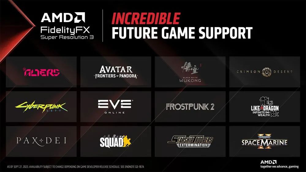 在遊戲支持方面,目前已有正式支持FSR 3的遊戲已達19款。包括《魔咒之地》《不朽者傳奇》《阿凡達:潘多拉邊境》《使命召喚20:現代戰爭3》等。根據計劃,今年還會在《最後生還者:第一部》《賽博朋克2077》《黑神話:悟空》等遊戲中實裝FSR 3。