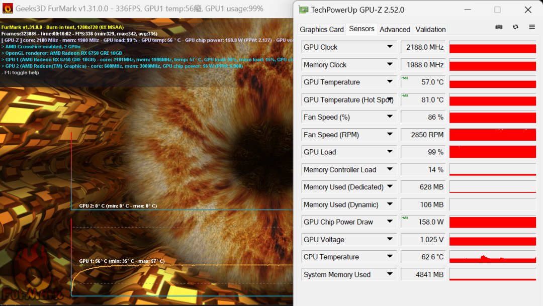 在溫度和功耗測試部分,我們在23℃的測試環境中,使用Furmark連續考機30分鐘。在默認的風扇設置下,藍寶石RX 6750 GRE 10G D6白金版的最高考機溫度爲69℃,而此時風扇轉速只有1336RPM,幾乎聽不到風噪聲。如果我們手動把風扇轉速拉到最大,那顯卡的最高溫度就只有57℃了,熱點溫度爲81℃,散熱表現比較出色。同時可以看到藍寶石RX 6750 GRE 10G D6白金版的峯值TGP只有158W,這款藍寶石顯卡不僅性能強,還很節能靜音,溫度和能耗比表現非常不錯。