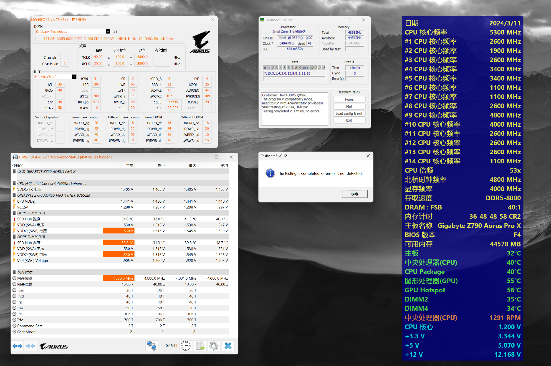 超频流程之前有过详细分享,整个过程就是不断调整BIOS内存参数设置,重启测试稳定性,直到能够TM5稳定过测不报错,并且长时间日常使用没有出现系统稳定性问题。比如我这里就使用TM5配合针对DDR5内存优化后的1us配置文件进行压力测试,多次3轮测试不报错,算是把这套内存稳定在了8000MHz频率。