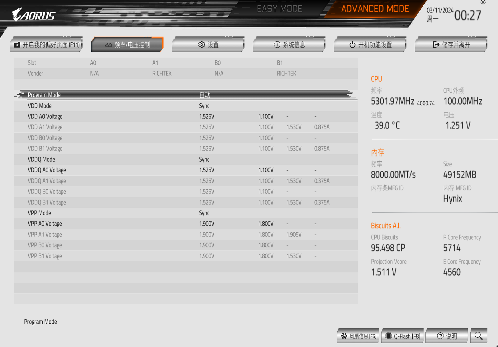 这里分享一下我最终的8000MHz超频参数,VDDQ CPU电压1.405V、VDD2 CPU电压1.44V。