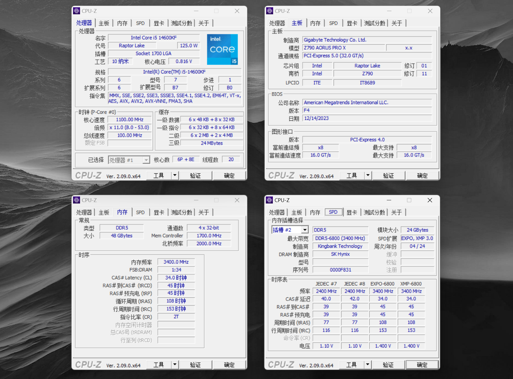 首先使用CPU-Z查看一下CPU和内存信息:处理器14600KF,主板技嘉Z790 AORUS X,内存制造商Kingbank,DRAM制造商SK海力士,24年第04周生产,内存原始频率2400,预设一组XMP频率,一组EXPO频率,均为6800MHz时序CL34-45-45-108,预设电压为1.4V,海力士M-die的电压整体偏低一些,就6800MHz来看,目前测过的几套内存电压基本都在1.35~1.4V之间。