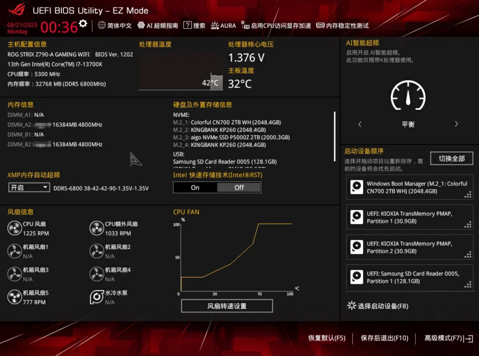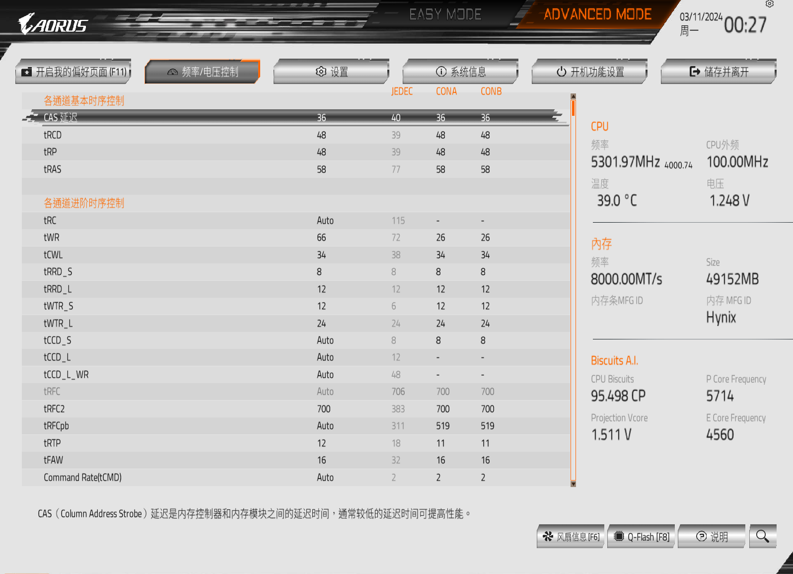 在BIOS中可以看到金百达白刃6800MHz 48GB套条仅有一组XMP、一组EXPO预设,这里就不做初始频率的性能测试了,直接选择XMP1,测试XMP 6800MHz频率的内存性能。