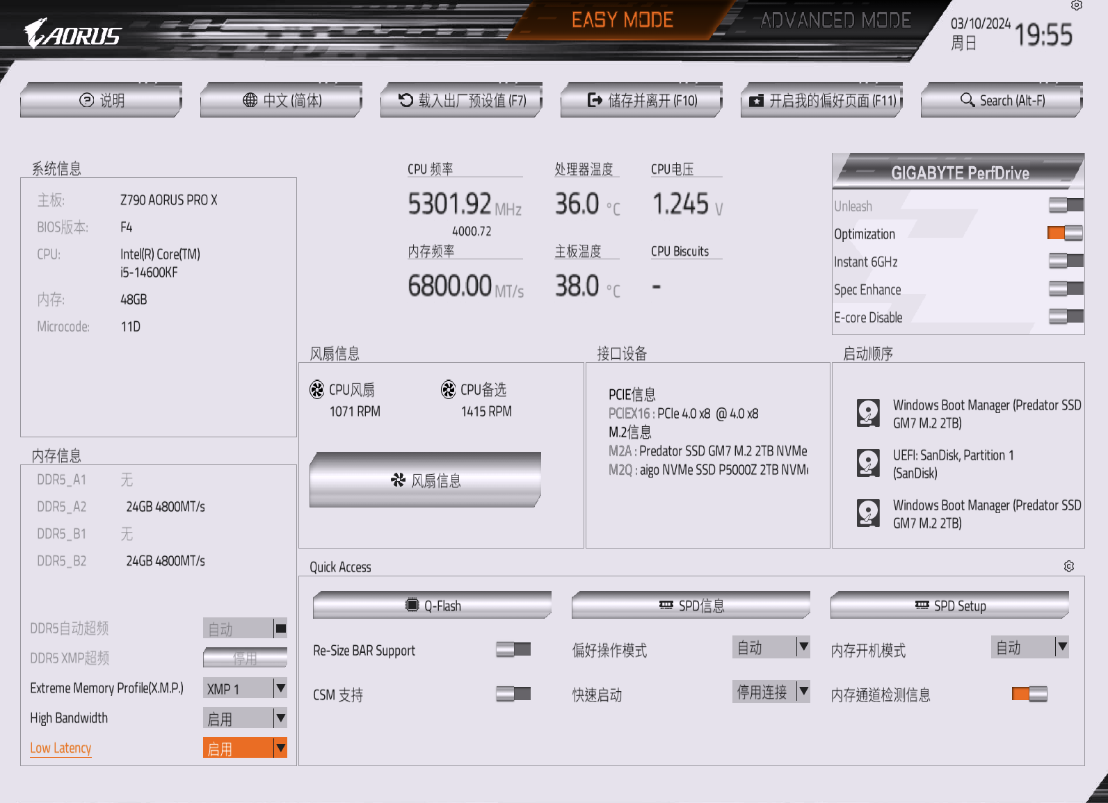 我这里的测试平台是我目前在用的主力平台,技嘉Z790冰雕X主板搭配Intel 14代酷睿i5-14600KF,主板官方给到的DDR5内存支持最高可以达到8266MHz+OC频率,并且技嘉主板BIOS内设的高带宽低延迟功能,还可以自动优化内存运行性能。